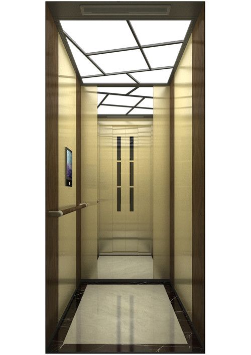 天井:噴砂不銹鋼  后側(cè):彩紋鋼板浮雕木紋+鏡面不銹鋼  左右:彩紋鋼板浮雕木紋+彩紋鋼板大理石紋+鏡面飾條  前側(cè)+轎門:香檳金鏡面  地板:PVC大理石紋