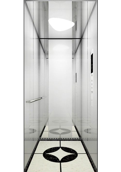 轎廂款型:香榭麗舍  天井ECO-XL,木飾框(亮白)+鏡面不銹鋼  前側(cè)板鏡面不銹鋼  門楣鏡面不銹鋼  兩側(cè)木飾面(亮白)+鏡面不銹鋼  后側(cè)板木飾面(亮白)+鏡面不銹鋼+裝飾畫(選配)  轎門鏡面不銹鋼  操作盤BC-T8A1  扶手皮紋(銀白)+鏡面不銹鋼  地板大理石拼花(西班牙米黃+金鑲玉+水晶啡)